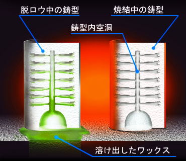 低温で加温し、ワックスを鋳型から排出させます。実際には、鋳型に残留する水分が沸騰する力を借りて、溶けたワックスが鋳型外へ排出されます。ですから、乾燥し過ぎた鋳型は脱ロウ効果が著しく低下します。