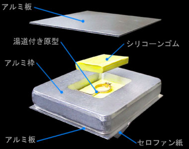 アルミ板の上に置いたアルミ枠の底部に、枠の厚さの約半分程の板状のシリコーンゴムを置きます。その際、原型の周りには最低5㎜程度の肉厚が必要です。その上に、金属三角錐に装着した原型をセットします。