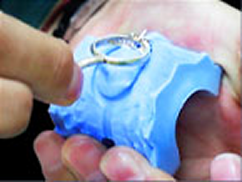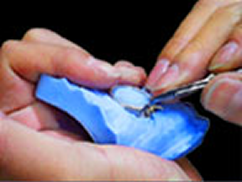 宝飾品などで、特に石座や穴などが多くあるデザインの場合、ゴムカットの際にゴムを引っ張りながらカットするため、引っ張り・引裂き強度が弱いシリコーンゴム(一般的に低価格もの)を使用すると、ゴムカット中に予定外の場所からゴムが裂けてしまう可能性があるので、上質なシリコーンゴムを使用します。