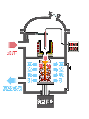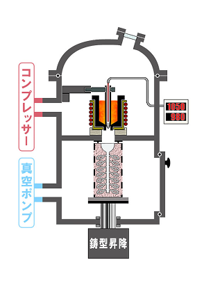溶解室と鋳造室の2つに分けた圧力容器(チャンバー)の構造となっています。上部の溶解室で金属を溶解し、下部の鋳造室に設置した鋳型に注湯します。