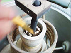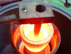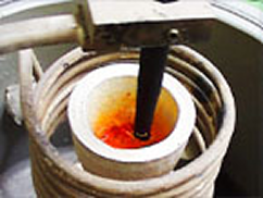 ルツボの底部に穴があり、その穴を耐熱性のストッパーで押さえておきます。地金が完全に溶解した後にこのストッパーを外し地金を鋳型に注ぎ入れる方式です。