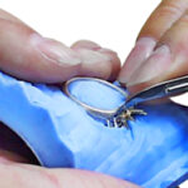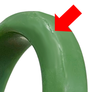 宝飾品などで、特に石座や穴などが多くあるデザインの場合、ゴムカットの際にゴムを引っ張りながらカットするため、引っ張り・引裂き強度が弱いシリコーンゴム(一般的に低価格もの)を使用すると、ゴムカット中に予定外の場所からゴムが裂けてしまう可能性があるので、上質なシリコーンゴムを使用します。