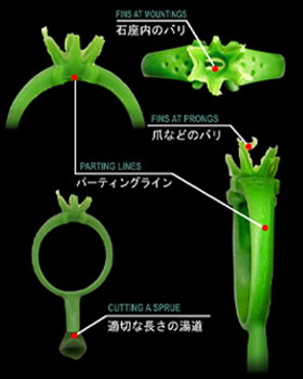 射出され成型されたワックス型は、1つひとつ検品を行い、『充填不足』『気泡』『歪み』『バリ』『湯じわ』『パーティングライン』の有無や状態などをチェックします。