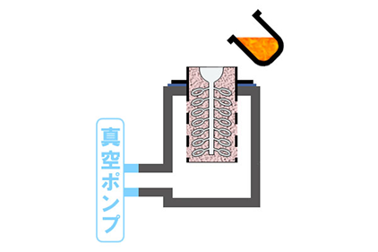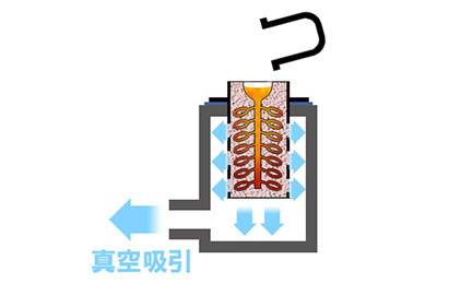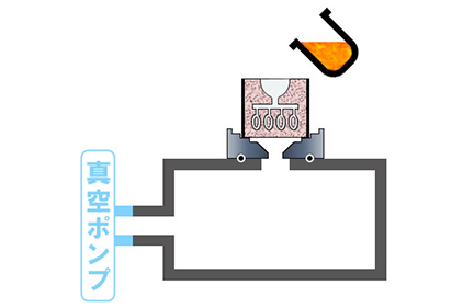 鋳型を真空容器に入れ全体を真空吸引します。鋳型の湯口部は鋳型下部と分離されています。鋳型上部には底注ぎ式のルツボが設置され、ルツボ内で溶解された金属をルツボの穴から下へ注湯します。