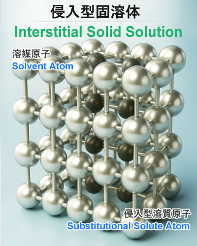 溶媒原子格子点(レギュラーな位置)はそのまま保たれ、溶質原子がその間の空隙(間隙サイト)を占める。