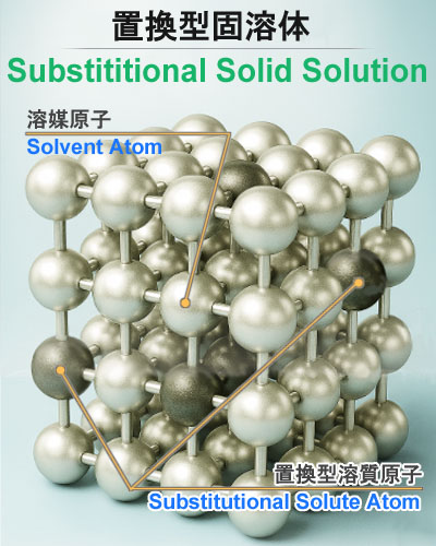 溶媒原子の格子点(レギュラーな位置)はそのまま保たれ、溶質原子が溶媒元素の格子点と置き換わる構造。